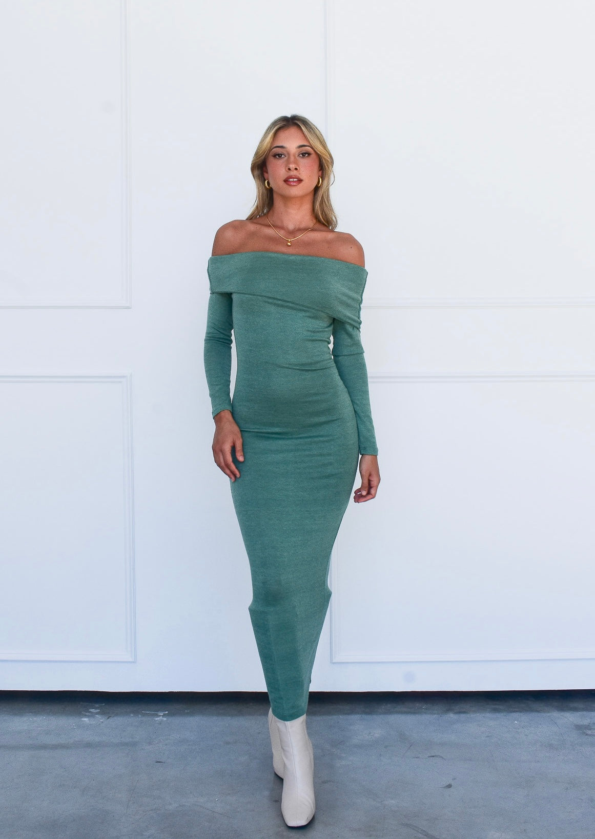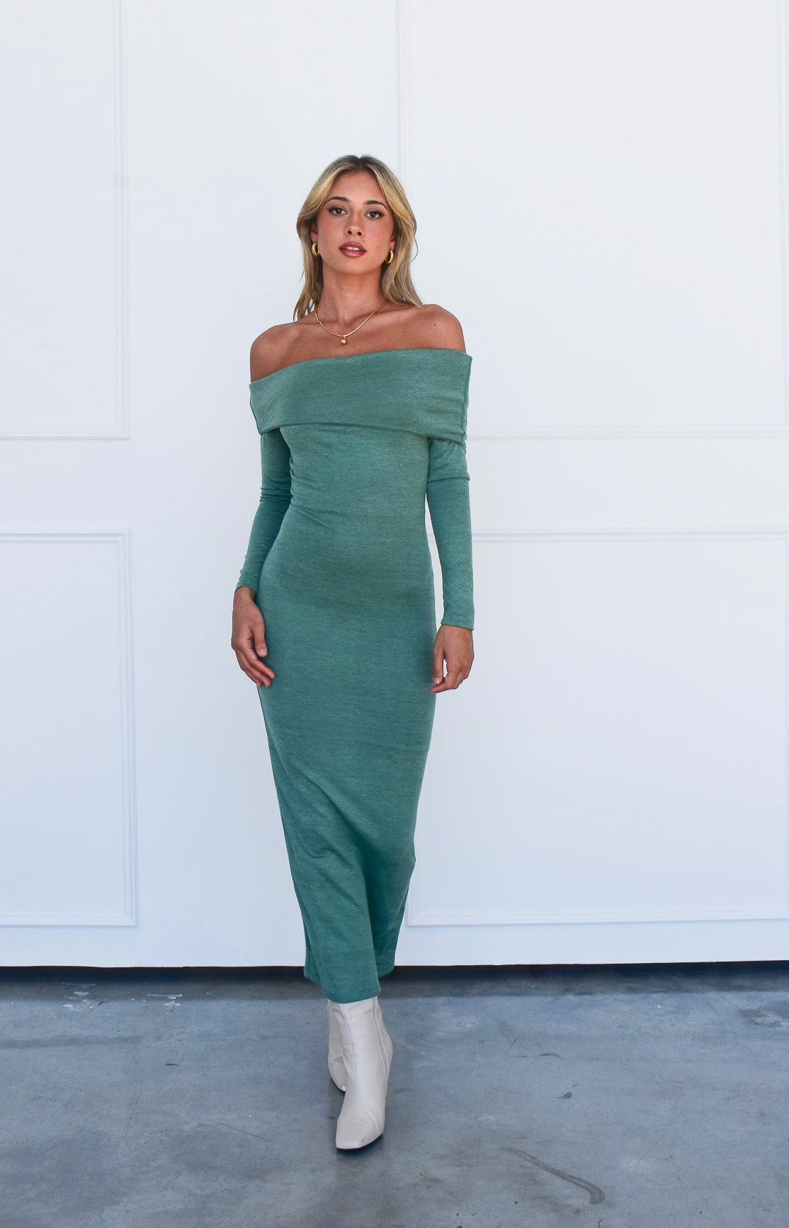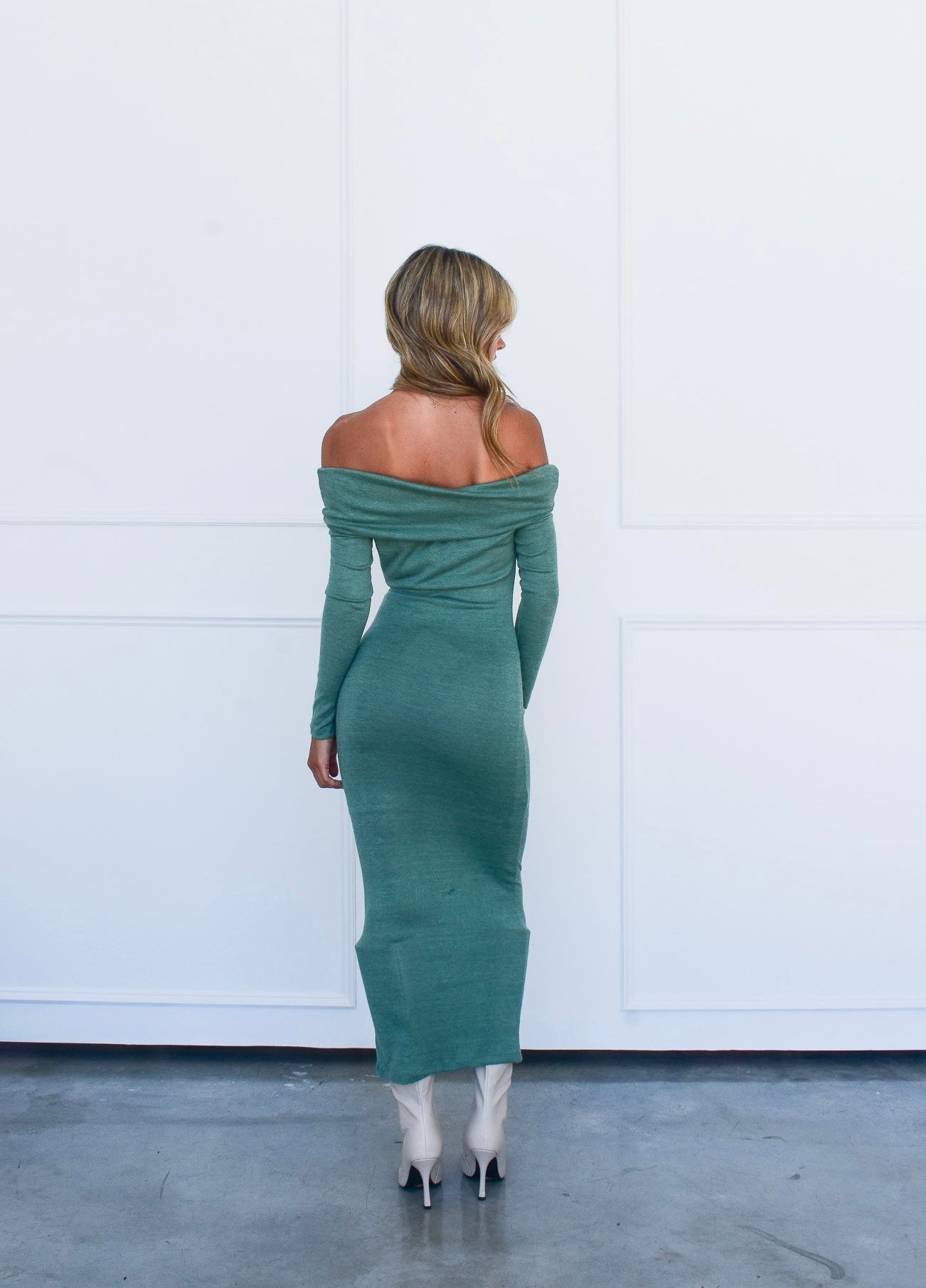 Our Petra Dress is perfect for the upcoming winter season. The off-shoulder detail is cute, but its long sleeves and midi length helps to keep you warm. Pair with knee high boots like we did with our model for a more formal look, or with sneakers to keep it casual.