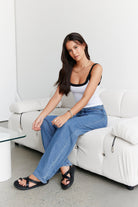 Our Miley top is the perfect basic that still provides a cool colour contrast. It shape is flattering but secure for everyday wear. Pair with our Leo Jeans or our Phoebe Skirt to form your everyday summer look. Or transition into the colder weather with a puffer or leather jacket. This top is also available in the reverse colourway.