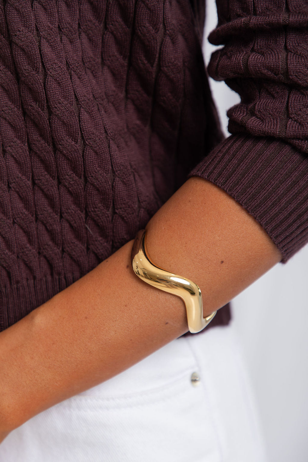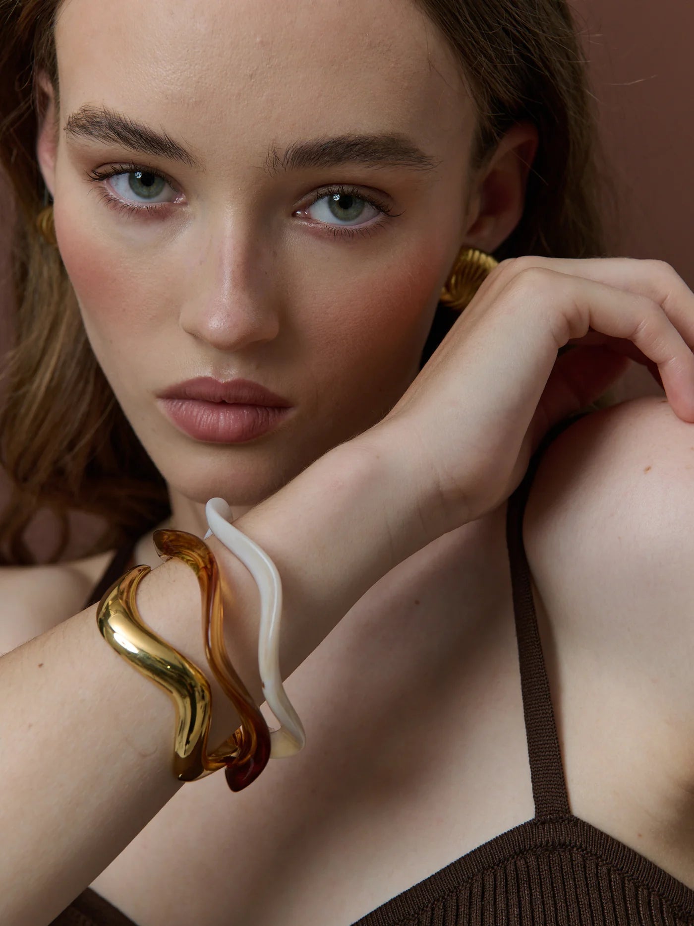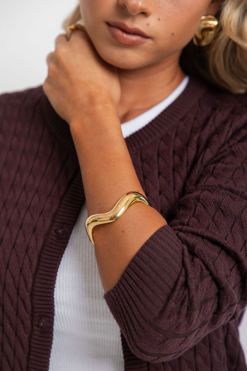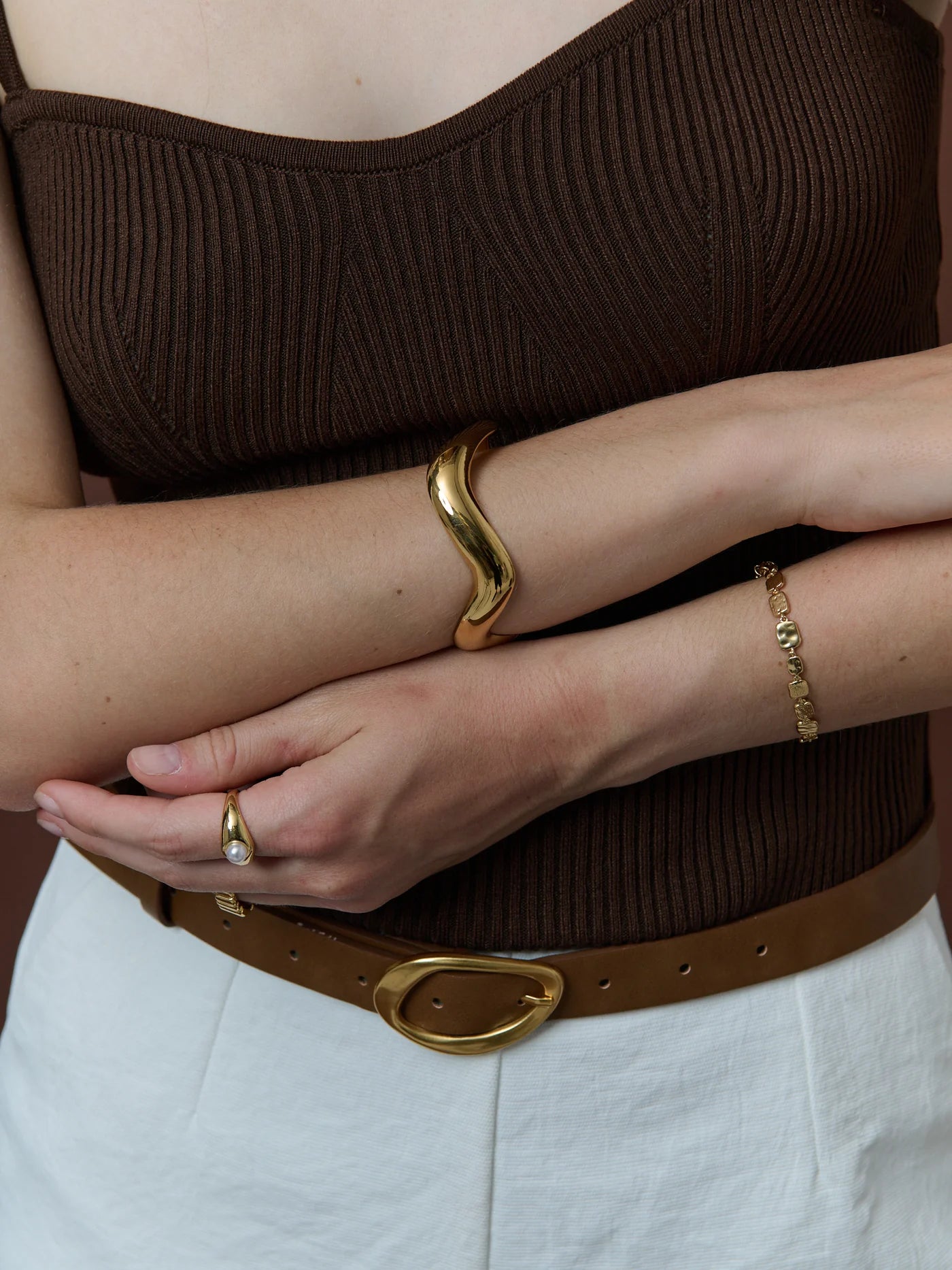 Add a chic touch to any outfit with our wavy CASPIN Bangle in Gold. With their lightweight feel, they are comfortable to wear all day long. A must-have accessory for any fashion lover